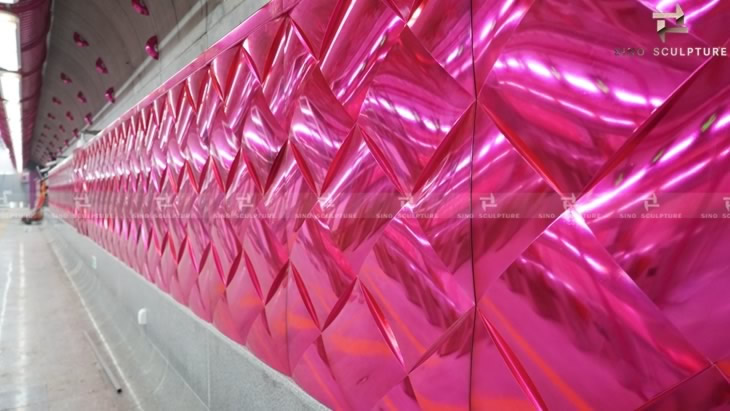 The work "Modern Times" at Xinglongbao Station, which won the "Top Ten Most Beautiful Subway Stations in China" award, breaks through the inertia of standard stations in general. The idea is to enlarge the entire station level into the interior of a lady's carrying bag in the form of a finished product. The precast concrete structure at the top is designed as a large zipper shape that runs through the entire station floor space, and the walls on both sides make the interior of the bag. The overhead zippers unfold to reveal the everyday items of young people. Perfume bottles and lipstick bags on the station floor are fun and artistic seats, with girly cute pink and metallic accents. Gray assembly station space. The art design of the station floor echoes the theme, style, and color palette of the station floor with imaginative spatial reconfigurations, and readymade enlargements of the form, taking into account the aesthetic value and practical function of public art.