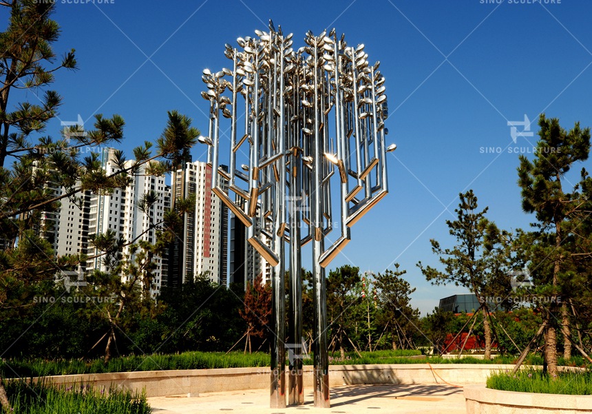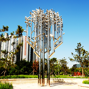 It is located in the south of Yantai Waterfront Road City Exhibition Center in China, about 9 meters high, made of stainless steel with a mirror finish. Symbolic meaning: life is like a tree! The work to the sky as the main shape of the tree, the trunk of the trunk center layers of progressive trunk image, symbolizing the district's economic and social undertakings flourishing, like the tree upright, uplifting upward.