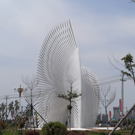 The large monument sculpture was designed by a professor of Qinghua University Wang Weibo in 2010. Its height is 16 meters and weighs 20 tons. It was successfully installed in Liaoning province in 2010. This sculpture is shaped like a peacock opening screen and a rising sail. Its main body is stainless steel with white paint, which means that it is full of inclusiveness, compatible with eclecticism, and embodies the emerging economy, culture, and politics. Carrying the spirit and connotation of Bayuquan city construction, symbolizing the beautiful vision of Bayuquan's social and economic sailing!