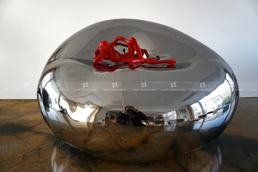 This is an interior artwork, was designed by Chinese artist Mr. Chen Wenlin, The red figure is one of his important creative elements and his artwork's distinguishing feature. Matching up the mirror-polished steel base with a super smooth surface, and reflecting the soft cure line. This stainless steel artwork is full of attractive to many collectors.
