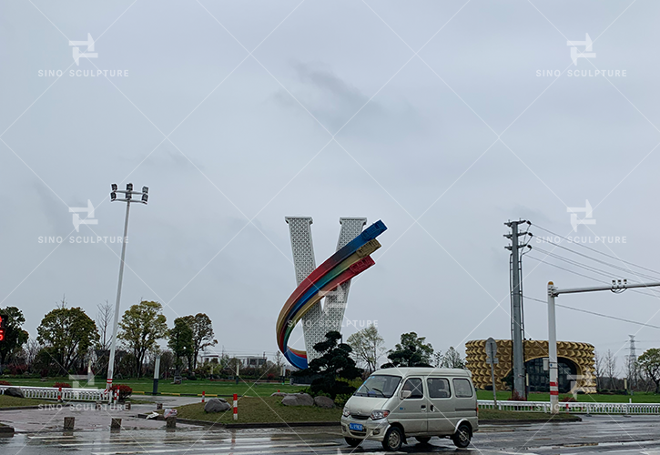 In the entrance of Volvo Town, there erected a 26meters high stainless steel monument in the shape of “V”, and 3 colored ribbons symbolize the road with steel car models toward the future.