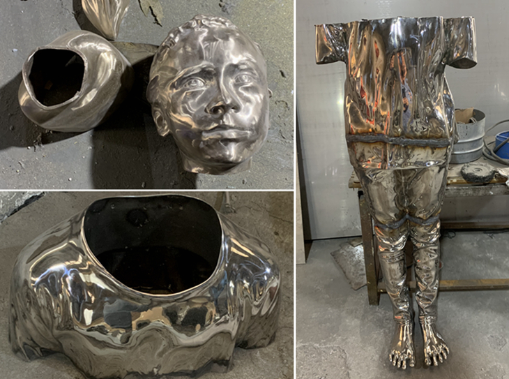 To avoid chemical reactions for two mixture materials, we came up with several ways to connect them in the location of the neck part, in the end, it was very successful. On the surface, it looks like a seamless connection, but it avoids the problem of chemical reactions when the two materials are welded together. Honest to say, the patination of this custom stainless steel figure sculpture is also a challenge for us this time, it seems like a very light rust color but with spots.